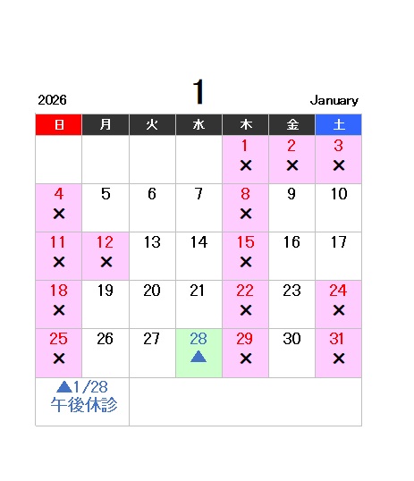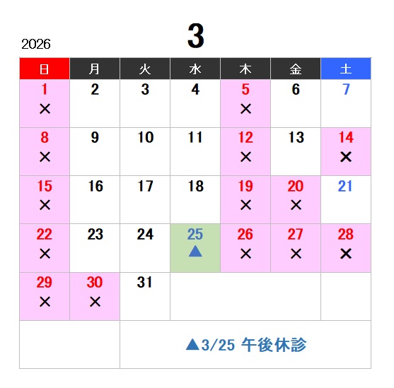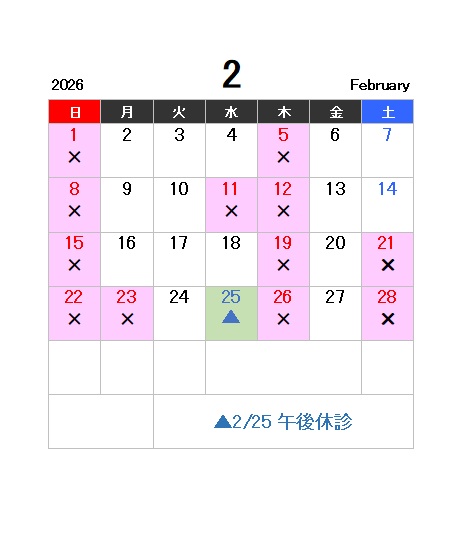 ※土曜日の診療は月に2回となっておりますので、日程をご確認の上ご来院ください。